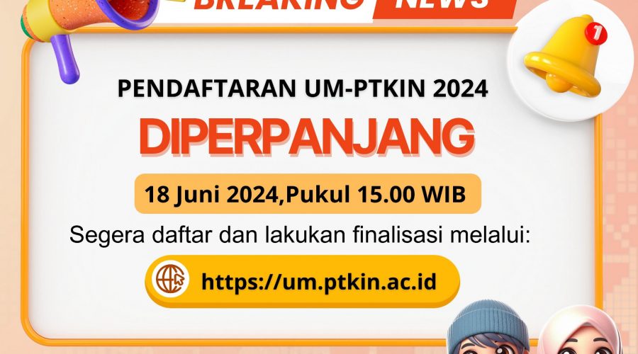 (Panitia Nasional PMB-PTKIN) — Panitia Nasional Penerimaan Mahasiswa Baru Perguruan Tinggi Keagamaan Islam Negeri (PMB PTKIN) 2024, mengumumkan perpanjangan masa pendaftaran Ujian Masuk Perguruan Tinggi Keagamaan Islam Negeri (UM-PTKIN) tahun 2024. Pendaftaran UM-PTKIN awalnya dibuka sejak 17 April -15 Juni 2024, kini diperpanjang hingga hari Selasa 18 Juni 2024 sampai batas waktu pukul 15.00 WIB. Perpanjangan pendaftaran UM-PTKIN ini tertuang dalam Surat Pemberitahuan Perubahan Jadwal UM-PTKIN 2024 No:B-281/PMB-PTKIN/VI/2024. Ketua Panitia...Read More