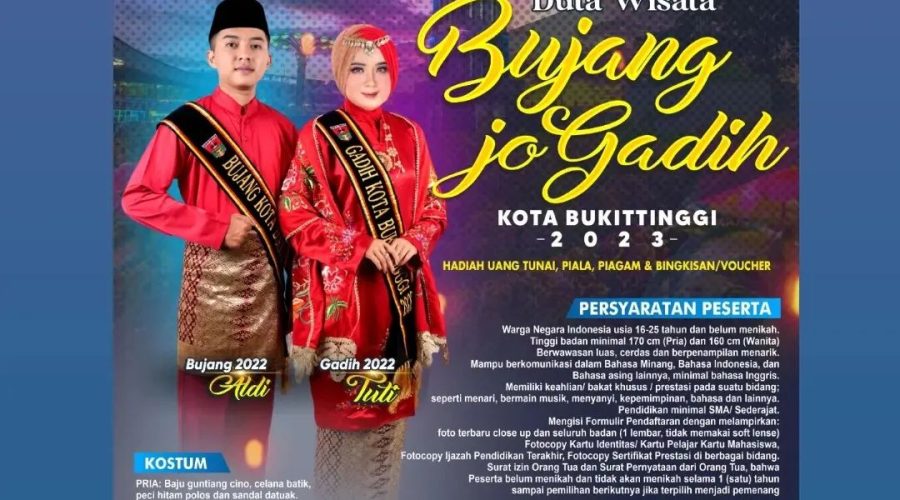 Dalam rangka mempromosikan Pariwisata Kota Bukittinggi, Pemko Bukittinggi melalui Dinas Pariwisata akan menyelenggarakan Pemilihan Duta Wisata Bujang jo Gadih Kota Bukittinggi Tahun 2023. DOWNLOAD INFORMASI DETAIL DI SINI ⇒Read More