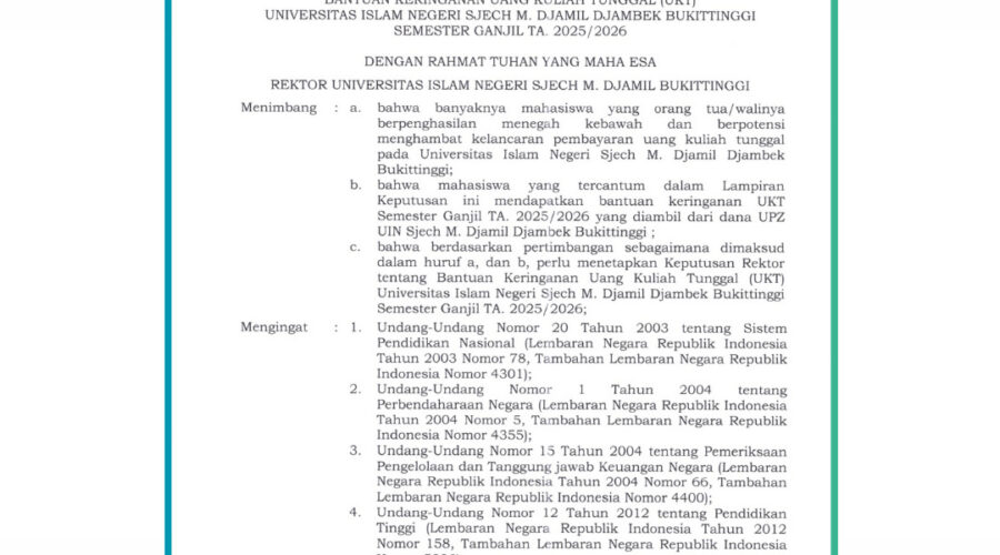 Bukittinggi (Humas) – Universitas Islam Negeri (UIN) Sjech M. Djamil Djambek Bukittinggi melaksanakan seleksi Ujian Masuk (UM) jalur Mandiri pada Kamis, 31 Juli 2025. Kegiatan ini berlangsung di Gedung Laboratorium Terpadu kampus UIN Bukittinggi dan menjadi tahap akhir dari seluruh rangkaian seleksi penerimaan mahasiswa baru Tahun Akademik 2025/2026. Pelaksanaan ujian terbagi ke dalam dua sesi dengan total peserta terdaftar sebanyak 158 orang. Namun, hanya 117 peserta yang hadir dan mengikuti...Read More