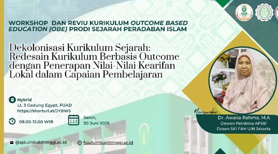 Bukittinggi, 30 Juni 2025 — Program Studi Sejarah Peradaban Islam, Fakultas Ushuluddin Adab dan Dakwah (FUAD) UIN Sjech M. Djamil Djambek Bukittinggi menyelenggarakan workshop kurikulum bertajuk “Dekolonisasi Kurikulum Sejarah: Redesain Kurikulum Berbasis Outcome dengan Penerapan Nilai-Nilai Kearifan Lokal dalam Capaian Pembelajaran.” Kegiatan ini menjadi bagian dari upaya strategis Prodi SPI dalam melakukan pembaruan kurikulum yang lebih kontekstual, responsif terhadap kebutuhan zaman, dan selaras dengan visi UIN Sjech M. Djamil Djambek Bukittinggi. Workshop...Read More