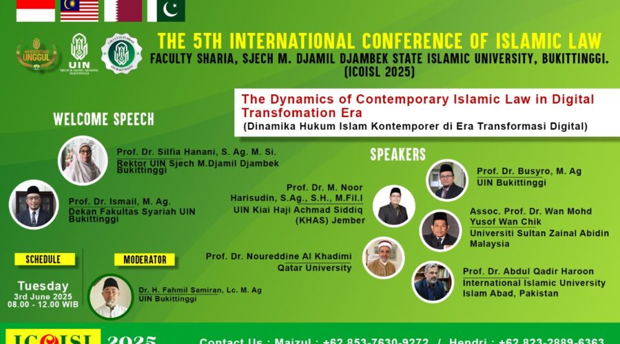 Bukittinggi (Humas) – Fakultas Syariah Universitas Islam Negeri (UIN) Sjech M. Djamil Djambek Bukittinggi kembali menggelar konferensi internasional bergengsi, The 5th International Conference on Islamic Law (ICoISL), pada Selasa (03/06/2025). Kegiatan ini mempertemukan para pemikir hukum Islam dari empat negara untuk mendiskusikan dinamika hukum Islam di era transformasi digital. Mengusung tema “The Dynamics of Contemporary Islamic Law in Digital Transformation Era”, ICoISL ke-5 dilaksanakan secara hybrid, dengan ratusan peserta mengikuti...Read More