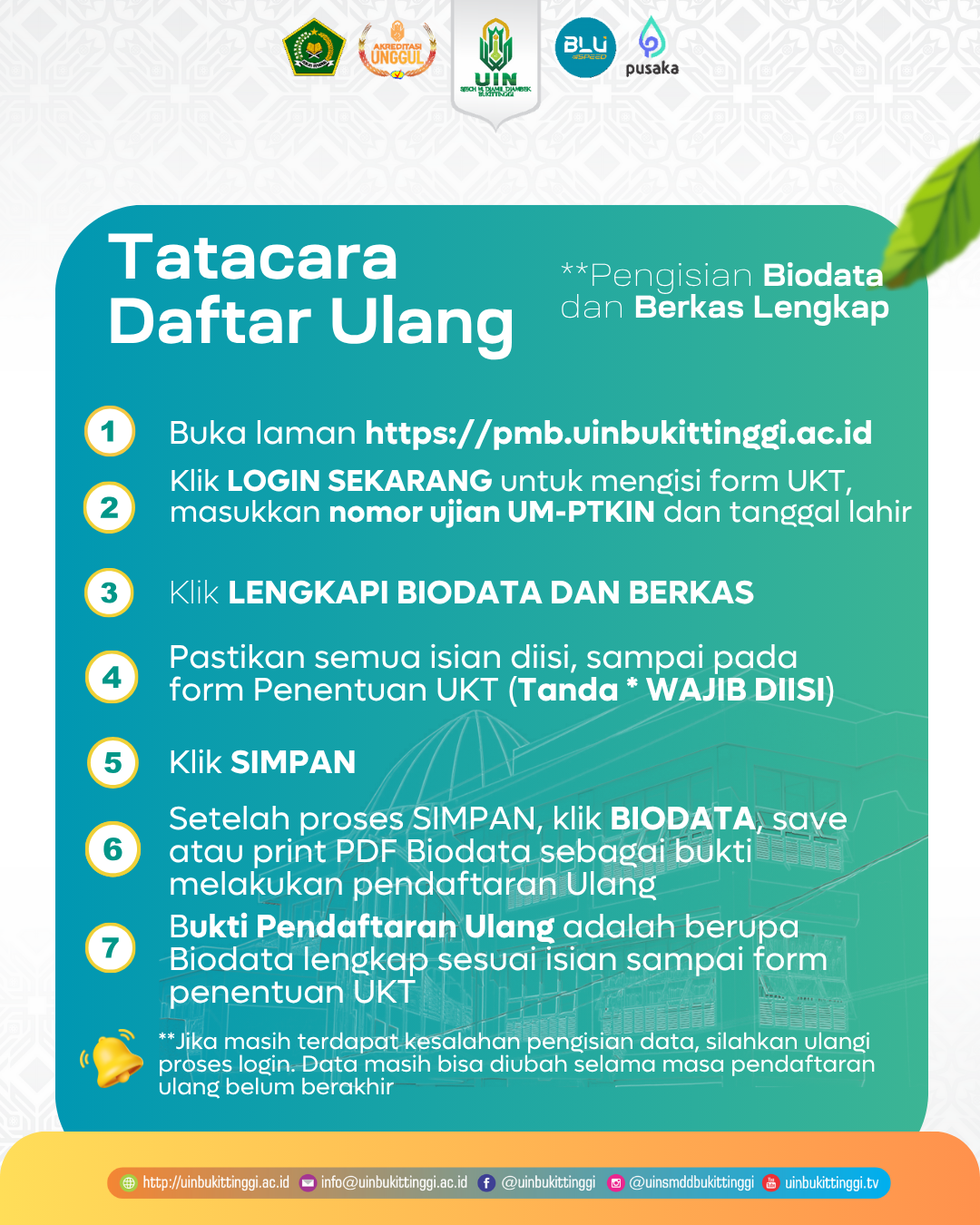 - Silahkan disimak panduan / tata cara proses pendaftaran ulang online pada sistem http://pmb.uinbukittinggi.ac.id – LIHAT PANDUAN LENGKAP DAFTAR ULANG DI SINI