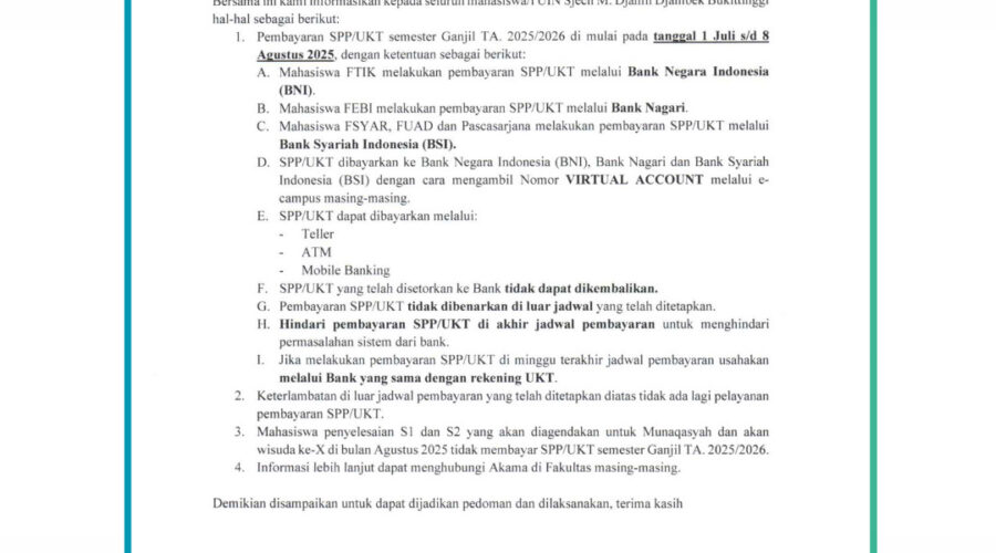 **Peserta Wawancara merupakan mahasiswa baru dari jalur UM-PTKIN yang melaksanakan daftar ulang mulai tanggal 15 Juli s.d 31 Juli 2025 (pada masa Perpanjangan daftar ulang). **Peserta Wawancara hanya yang berasal dari Sekolah Umum (SMA, SMK dan PKBM), tamatan MA dan Pondok Pesantren TIDAK mengikuti wawancara Keagamaan. **Jadwal Wawancara fleksibel mulai tanggal 2 Agustus hingga tanggal 5 Agustus 2025, silahkan langsung menghubungi penguji wawancara lewat kontak yang telah disediakan. **Wawancara dilaksanakan...Read More