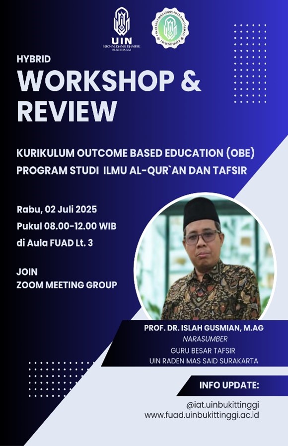 Bukittinggi (Humas) – Program Studi Ilmu Alqur’an dan Tafsir (IAT), Fakultas Ushuluddin, Adab, dan Dakwah (FUAD), UIN Sjech M. Djamil Djambek Bukittinggi menggelar workshop kurikulum bertajuk “Redesain Kurikulum Berbasis Outcome dengan Penerapan Nilai-Nilai Kearifan Lokal dalam Capaian Pembelajaran Ilmu Alqur’an dan Tafsir”, pada Rabu (02/07/2025).