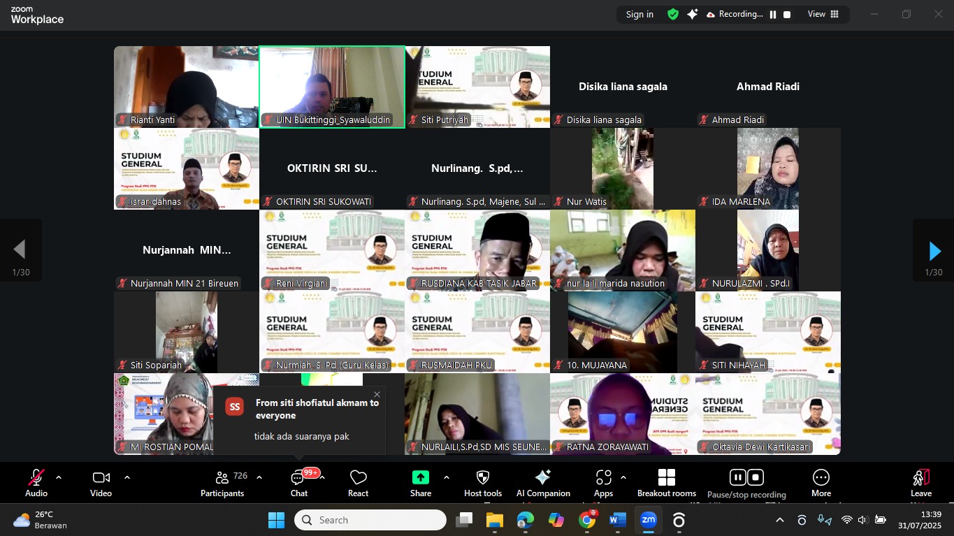 Bukittinggi(Humas) — Program Studi Pendidikan Profesi Guru (PPG) UIN Sjech M. Djamil Djambek Bukittinggi sukses menyelenggarakan kegiatan Studium General bertajuk “Meneguhkan Moderasi Beragama dalam Praktik Pendidikan: Peran Strategis Guru PAI di Era Digital”, pada Kamis, (31/7/2025). Acara ini berlangsung secara daring melalui platform Zoom Meeting dan diikuti lebih dari 1.200 peserta, yang terdiri atas mahasiswa PPG Batch 1, jajaran pengelola prodi, serta pimpinan kampus..